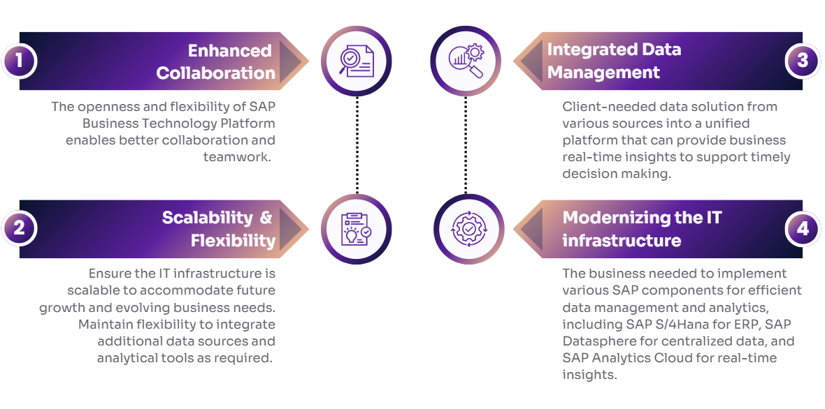 Stridely Solutions streamlined the clients’ data management, enhanced collaboration, and provided real-time insights to support better decision-making and future growth. The implementation of SAP S/4HANA, SAP Datasphere, and SAP Analytics Cloud enabled a modernized IT infrastructure, transforming the client’s data management processes and facilitating seamless integration for future scalability.